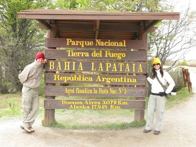 Paramos, por fim, na baía Lapataia, onde termina a Rodovia n.º 3, que liga o Ushuaia ao Alaska e tem por volta de 17 mil quilômetros de extensão (e que passa por Buenos Aires).