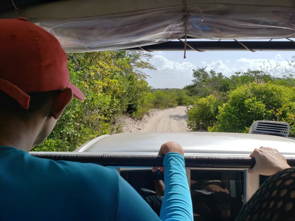 Em um veículo 4×4 da Agência São Paulo Ecoturismo, cruzamos o Rio Preguiças, sobre uma pequena balsa. Percorremos, em seguida, uma estrada de areia, atravessando riachos e charcos, por aproximadamente 50 minutos. Achei bem divertido o caminho!