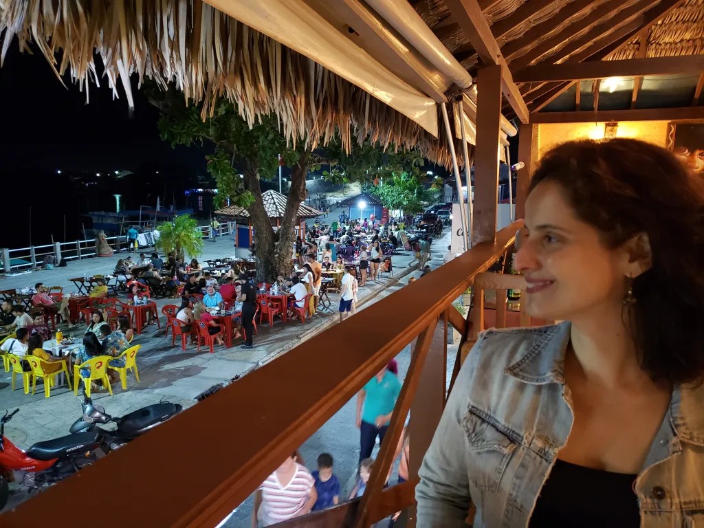 Depois que o sol se pôs, retornamos à pousada, tomamos banho e fomos jantar no delicioso Restaurante da Sessé um refinado camarão com arroz cremoso, dentro do abacaxi.