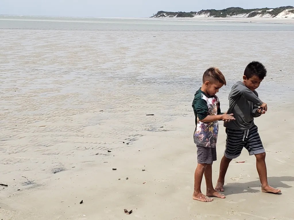 Fizemos uma caminhada, pela orla, passando por dunas, mangues, rios, bem como pelo mar. Enquanto isso, avistávamos pássaros e também pescadores trabalhando na feitura de redes, na pesca e na secagem de peixes e camarões. Vimos, ainda, descartes do mundo todo, atirados no mar e que vão parar naquelas bandas, até mesmo garrafas plásticas vindas da Malásia (infelizmente as correntes marítimas levam o lixo para lá).